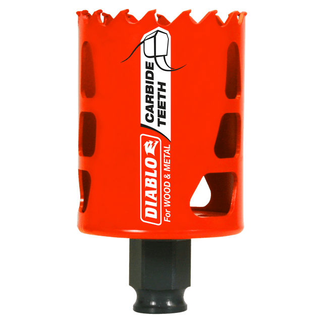 Diablo introduces the first carbide-tipped hole saws on the market to cut both wood and metal (wood, nail-embedded wood, plastic, aluminum, metal, cast iron, stainless steel and metal). Delivering 50 times longer cutting life than bi-metal, these new carbide-tipped hole saws offer faster cutting performance and increased productivity.
