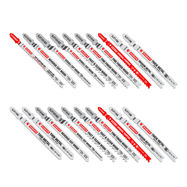 Diablo’s jig saw blades are designed for superior performance and longer cutting life in wood, metal and plastics. This 20-piece set features a range of blades, including bi-metal for clean wood, nail-embedded wood, metal and plastics; high carbon steel for soft woods, and high speed steel for metal. Each blade included in this set is optimized to deliver effortless, clean cuts. T-shank design fits all combo and most U-shank cordless and corded jig saws.