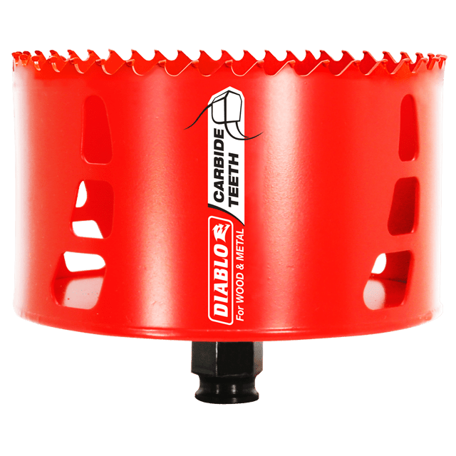 Diablo introduces the first carbide-tipped hole saws on the market to cut both wood and metal (wood, nail-embedded wood, plastic, aluminum, metal, cast iron, stainless steel and metal). Delivering 50 times longer cutting life than bi-metal, these new carbide-tipped hole saws offer faster cutting performance and increased productivity.