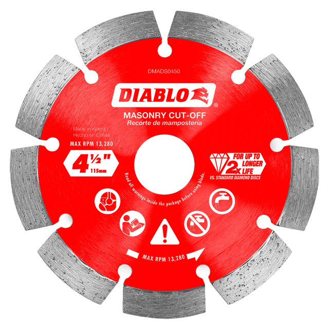 Diablo’s diamond segmented masonry cut-off discs provide extreme durability and longer life in concrete, concrete with rebar, brick and cinder block. These diamond rimmed discs deliver up to 2X longer cutting life versus standard diamond cut-off discs. The disc’s industrial-grade diamonds with hardened disc body delivers lasting durability and maximizes cutting quality in hardened materials even in extreme applications.