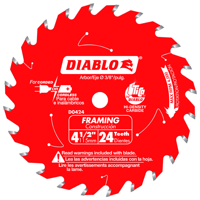 Diablo’s 4-1/2″ Cordless Framing blade is ideal for general construction applications, including fast, efficient ripping and crosscutting. Diablo’s blade cuts rough framing lumber, high quality finish lumber, plywood, OSB, and hardboard siding with the smoothest, fastest and most accurate cut. The thin kerf design requires less cutting power from the user and the saw for better control over the cut. Diablo′s unique design, extra-tough steel plate and proprietary carbide tips deliver longer life — and frames more houses — than other framing blades