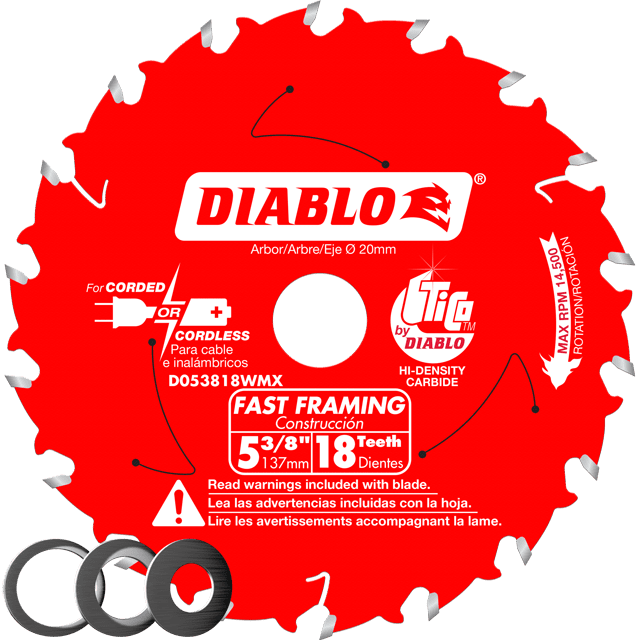 Diablo’s fast framing saw blades produce accurate, smooth cuts on framing materials without bogging down your cordless saw’s battery. This 20mm arbor saw blade includes three additional bushings that allow your blade to also fit on 1/2″, 5/8” or 10mm arbor saws. These blades feature Diablo made TiCo Hi-Density Carbide engineered exclusively to maximize life, performance and durability in wood cutting applications. The thin kerf body minimizes material removal and requires less cutting power, delivering fast, clean rips and cuts.