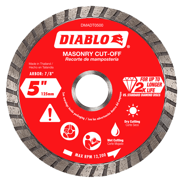 Diablo’s diamond turbo masonry cut-off discs provide extreme durability and longer life in concrete, brick and cinder block applications. These continuous rimmed diamond discs deliver up to 2X longer cutting life versus standard diamond cut-off discs. The disc’s industrial-grade diamonds coupled with a hardened disc body delivers lasting durability and maximizes cutting quality in hardened materials even in extreme applications.