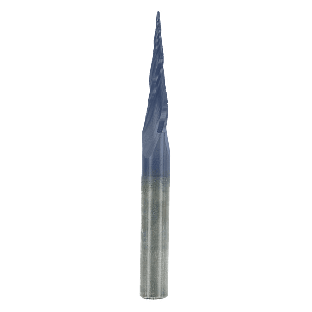 6.2° x 1/32″ Tapered Ball Tip Solid Carbide Bit. Includes 3 flutes and 1/32″ diameter. 1/4″ Shank. This solid carbide carving bit features an extremely fine 1/32″ diameter tip for ultra-detailed cuts. The 3 flute design provides fast chip clearance in deep cuts.Ideal for Wood, Wood Composites, Plastics (Hard & Soft), and Aluminum for 2D and 3D Carving.