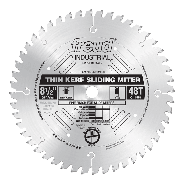 This thin kerf industrial blade provides a superior finish cut with sliding compound miter saws. The 5° negative hook angle helps prevent the blade from being too aggressive and pushes the work piece down and towards the fence. Thin kerf blades remove less material than standard carbide blades, thus requiring less horsepower to produce equally good results..