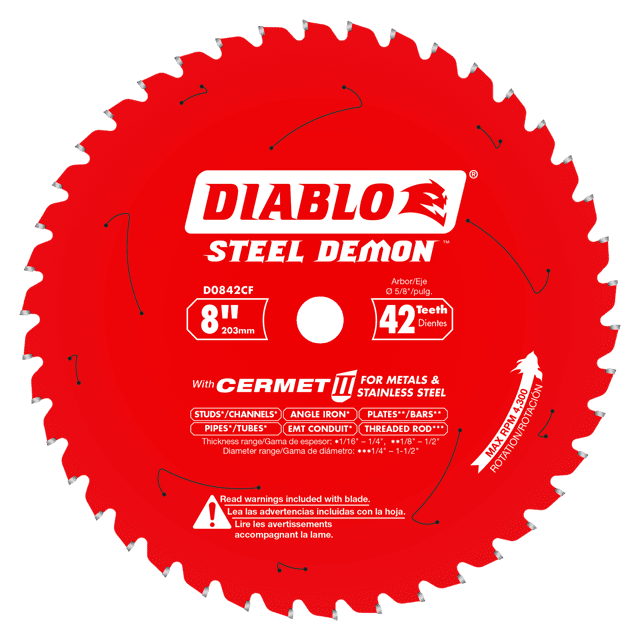 Diablo’s Steel Demon Cermet II saw blades are redefining metal cutting, and the jobsite, by introducing exclusive innovation for cutting metals and stainless steels with a cordless or corded circular saw. The specially formulated Cermet II teeth provide high heat tolerance and increased hardness for superior wear and life delivering up to 25X longer life, 50X cooler cuts and 10X faster cuts when compared to standard grinding discs. Featuring a special Triple Chip Grind and Perma-SHIELD® coating, these blades slice through the toughest of metals to produce precise, burr-free cuts with less sparks. A controlled cutting action produces larger chip sizes that generates less dust and airborne contaminates. The ability to cut through both metals and stainless steels eliminates the need for individually dedicated saw blades, offering a one-blade solution for the ultimate metal cutting performance and an unmatched value.